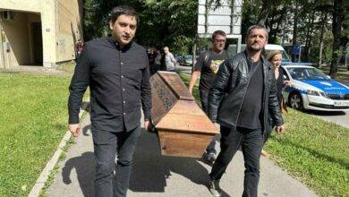 Zakon o stranim agentima “ubio” demokratiju: Demonstranti donijeli MRTVAČKI SANDUK pred NSRS