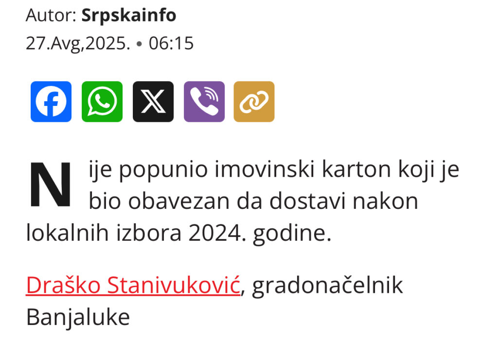 Gradonačelnik Banjaluke, Draško Stanivuković, još jednom je proglašen gubitnikom dana. Razlog je propuštanje obaveze da popuni i dostavi imovinski karton nakon lokalnih izbora 2024. godine, dokument koji predstavlja osnovni standard transparentnosti svakog izabranog funkcionera i zakonski je obavezan.