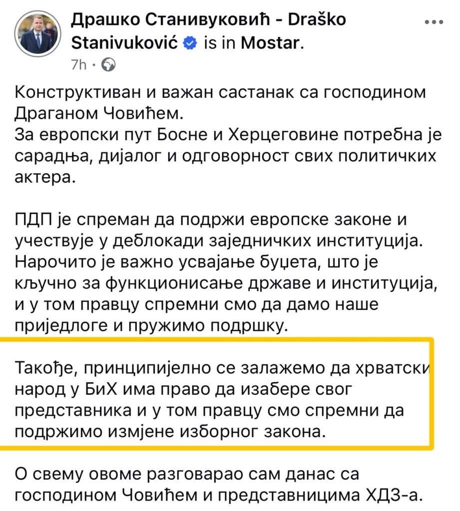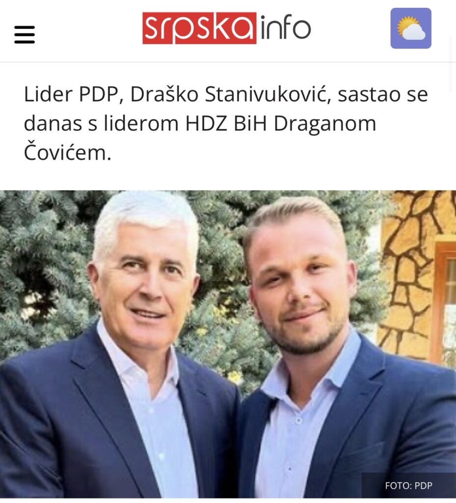 Milorad Dodik je više puta navođen kao zaštitnik hrvatskih interesa u BiH, a Draš­kovo ponašanje govori da je Hrvatska našla svog novog borbenog ovna. Dodik kao da Drašku poručuje: „Gdje ja stadoh, ti ćeš proći, što ne mogoh, ti ćeš moći.“ Ni manje ni više, tema razgovora Stanivukovića i Čovića bile su izmjene izbornog zakona — to je javno. Tajno je, najvjerovatnije, bilo i govora o „trećem entitetu“, a znamo da bi se tim potezom srušio Dejtonski mirovni sporazum, a samim tim i ozbiljno ugrozio status Republike Srpske.