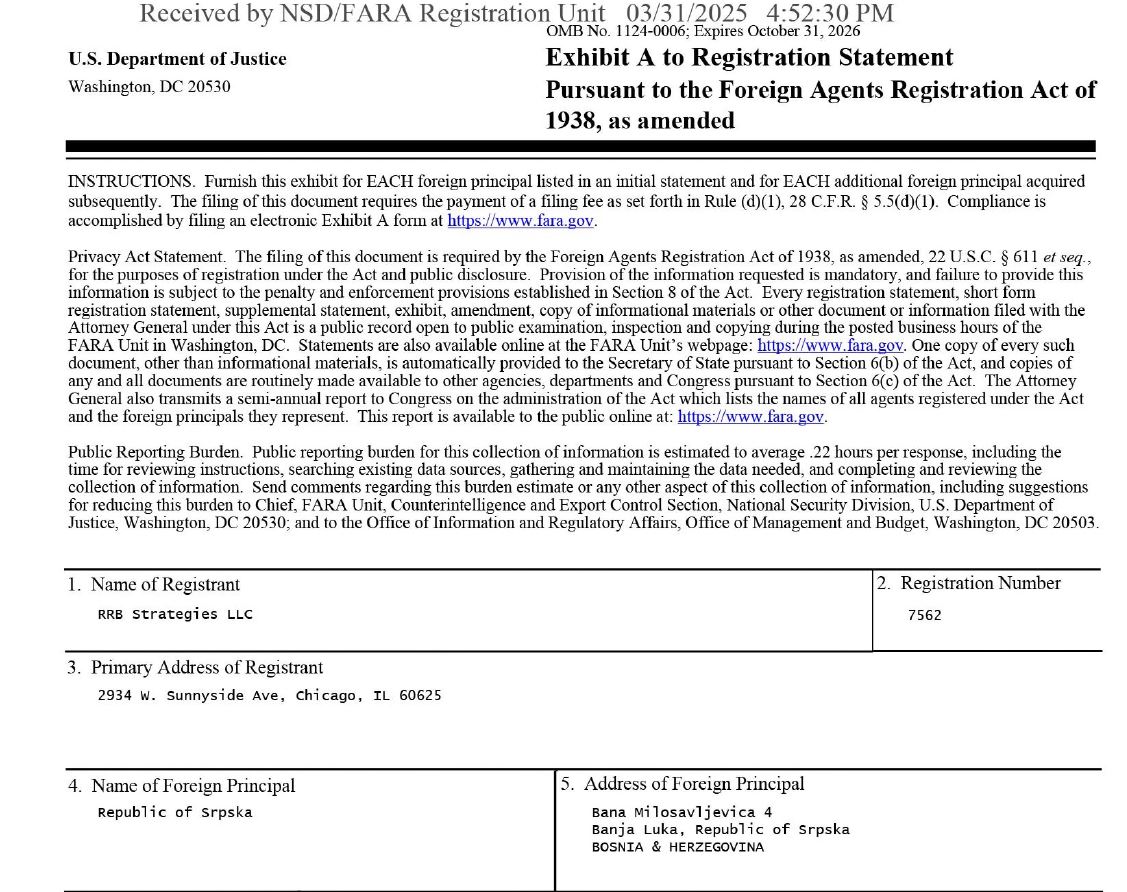 Na osnovu formulara podnesenog prema FARA zakonu (Foreign Agents Registration Act), vlada Republike Srpske zvanično je angažovala američku firmu RRB Strategies LLC iz Čikaga kako bi lobirala u ime vlasti Republike Srpske u SAD-u.