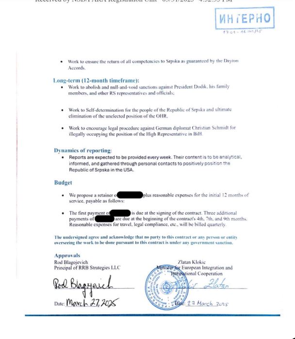 Dokument, koji je javno dostupan na sajtu Ministarstva pravde SAD-a, otkriva da je registracija izvršena preko Ministarstva za evropske integracije i međunarodnu saradnju, koje predvodi Zlatan Klokić, blizak saradnik bivšeg predsjednika Republike Srpske Milorada Dodika.
